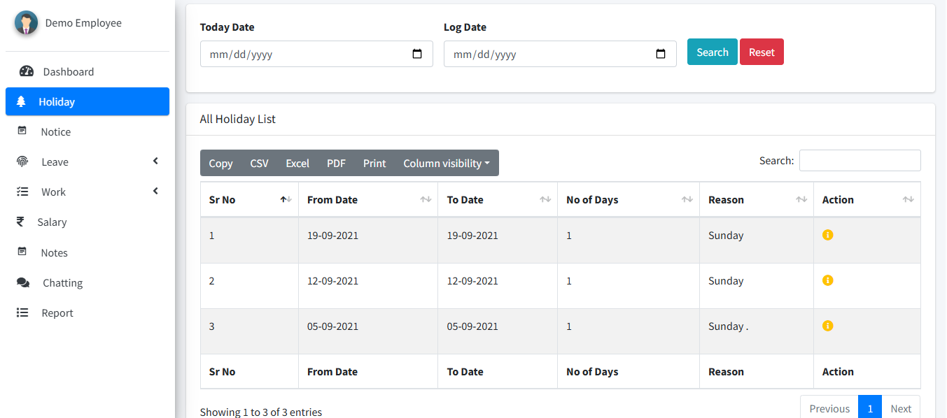 Admin can create, edit, and delete designations and holidays.